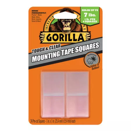 Gorilla Tough & Clear Mounting Tape Squares is a clear double-sided tape that mounts in an instant, for a long-lasting, weatherproof bond. The crystal clear adhesive tape won’t yellow over time. This mounting tape holds 1 pound per 4 squares of tape. Gorilla Tough & Clear Mounting Tape is perfect for indoor and outdoor projects and sticks to smooth and rough surfaces. Completing DIY projects is easy with this tough, double sided tape. Mount, build, and repair!