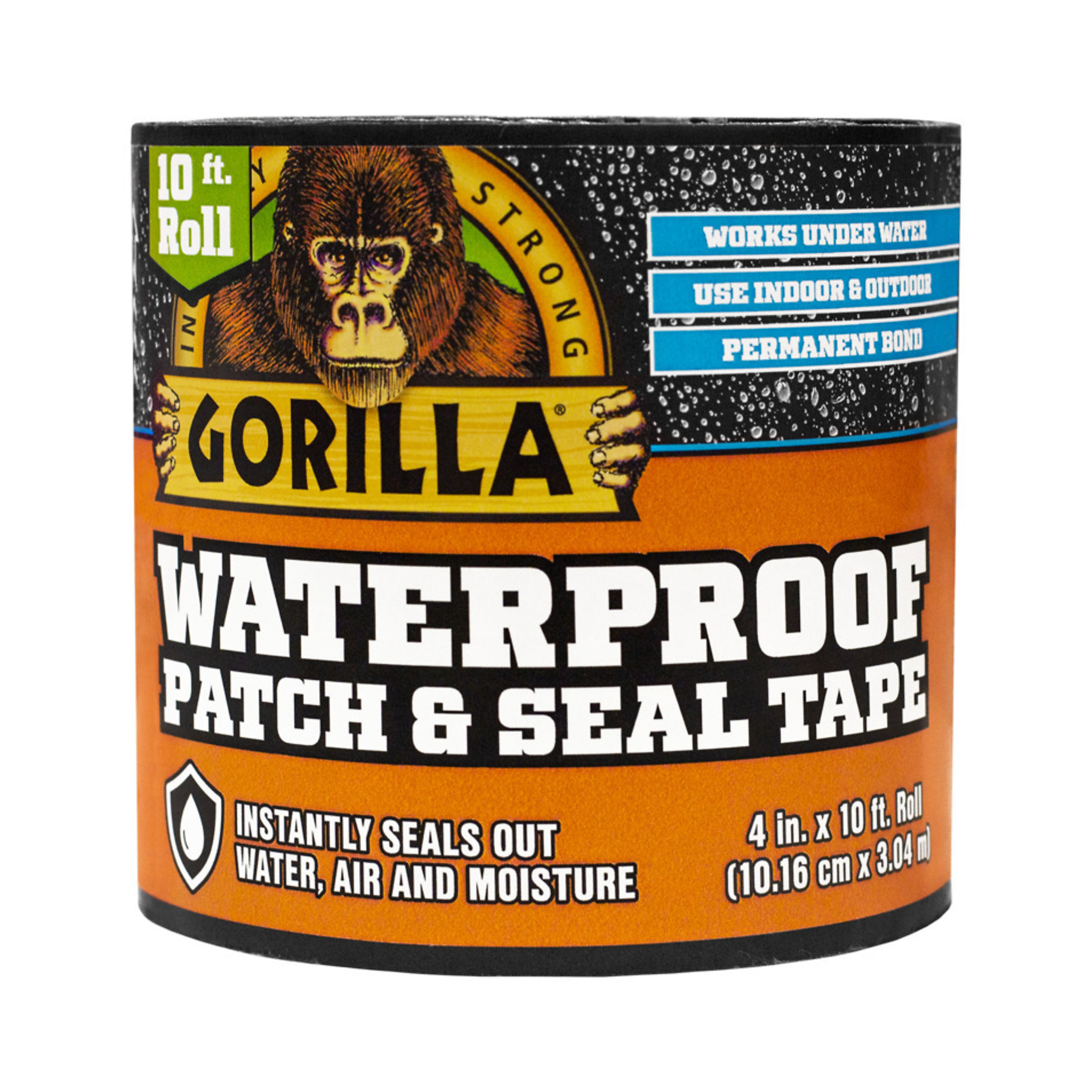 Gorilla Waterproof Patch & Seal Tape instantly seals out water, air, and moisture. With an extra thick adhesive layer and UV resistant backing this tape conforms to form a permanent bond indoors and out. At 4" wide use it to patch holes, cracks, gaps and tears, even underwater. Excellent for Home, Auto, Marine, Camping, RVs, Outdoors, and more!