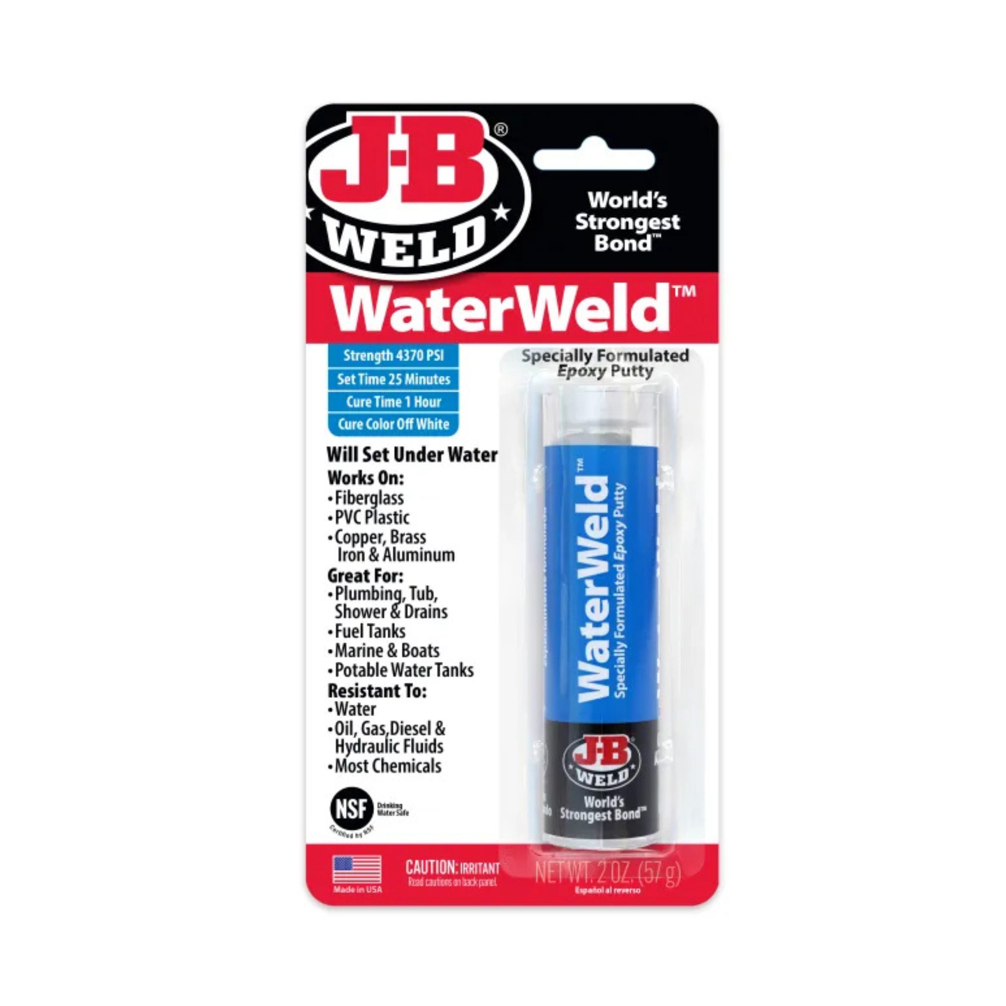 J-B Weld WaterWeld will plug or seal leaks and patch holes and cracks in almost anything. Ideal for repairing plumbing, fuel tanks, tub and shower, drains, pool and spa, boats and potable water tanks; setup occurs even under water. After curing, it can be drilled, tapped, filed, sanded and painted. WaterWeld has a set time of 25 minutes and sets hard in one hour. WaterWeld cures to an off-white color, is rated at a strength of 4370 PSI and will withstand water pressure up to 500 PSI and temperatures up to 250°F.