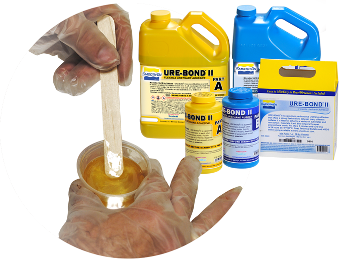URE-BOND™ II is a premium performance urethane adhesive compound that offers a strong flexible bond between many different surfaces. URE-BOND™ is ideal for adhering polyurethane rubber and other polymer products to many types of substrates (such as plaster, wood, cement, stone) and non-porous materials (such as glass, hard plastics and a variety of metals). URE-BOND™ II has also been used to repair torn polyurethane molds on a limited basis (with proper surface preparation). Working time is 5 minutes at room temperature (73° F / 23° C). Once mixed and applied, URE-BOND™ takes about 60 minutes to cure and yields a strong, flexible bond.