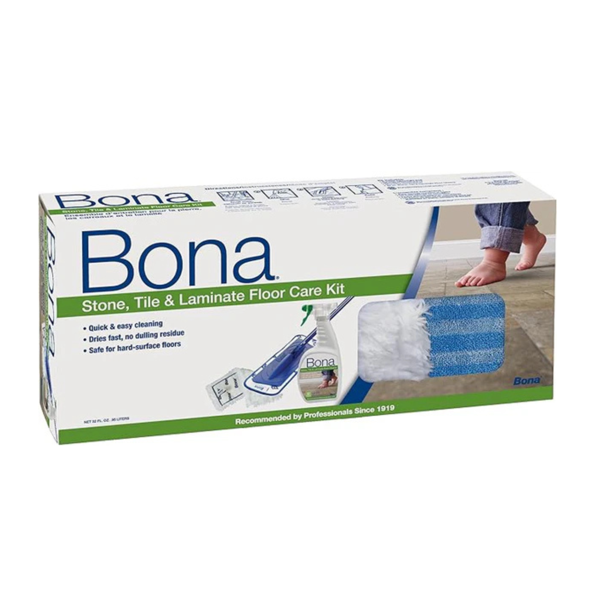 Bona's stone, tile and laminate floor care system contains everything a homeowner needs to clean their hard surface floors. The system includes: a durable, 4-piece mop handle with a 4-by-15-inch head, a microfiber easy-glide machine washable pad, machine washable microfiber dusting pad, and bona's premium non-toxic, no-residue 32-ounce stone, tile and laminate floor cleaner spray.