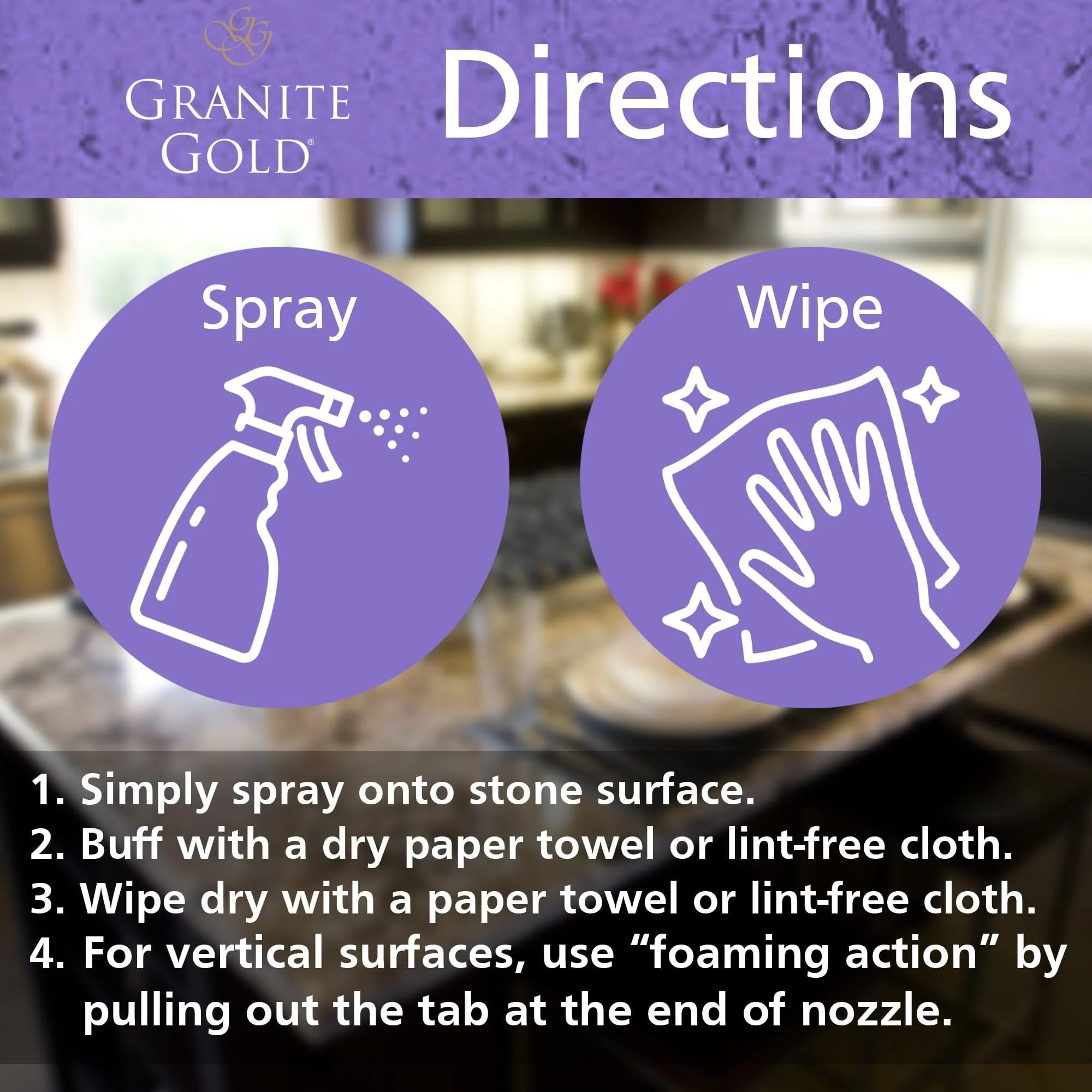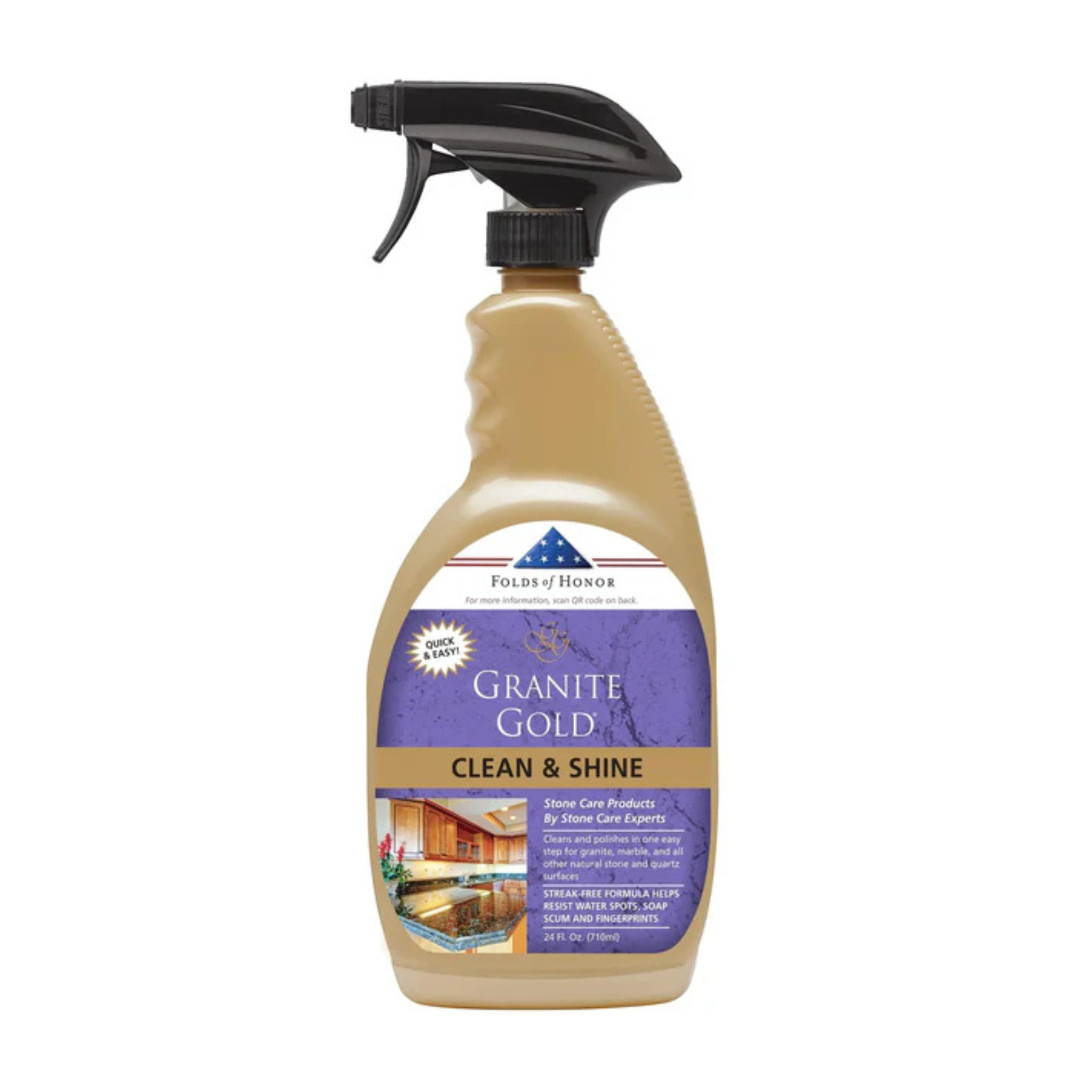 Save a little time cleaning and polishing granite, marble, travertine and all other natural-stone and quartz surfaces. Granite Gold Clean & Shine combines the best of both Granite Gold Daily Cleaner and Granite Gold Polish to quickly and easily remove spills and soils, leave a fresh citrus scent, and enhance shine and luster. A portion of the proceeds from the sale of this product will be donated to Folds of Honor to help them provide life-changing scholarships to the spouses and children of America's fallen or disabled military members and first responders.