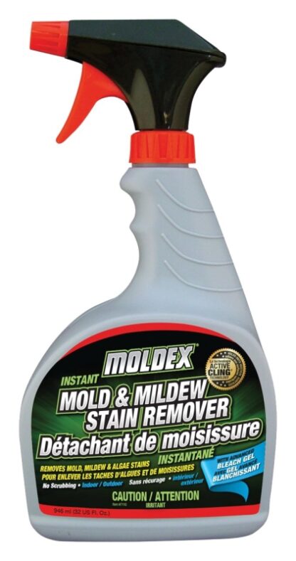 Moldex® instant mold and mildew stain remover is an aggressive cleaner that erases stains before your eyes. It delivers industrial strength cleaning action without scrubbing. Formulated with new Advanced Bleach Gel which is designed penetrate deep and eliminate mold & mildew stains. Our Active Cling™ Technology allows powerful cleaning agents to remain (or hold) onto vertical surfaces longer to achieve the highest effective contact time. Just spray on and watch stains completely disappear.