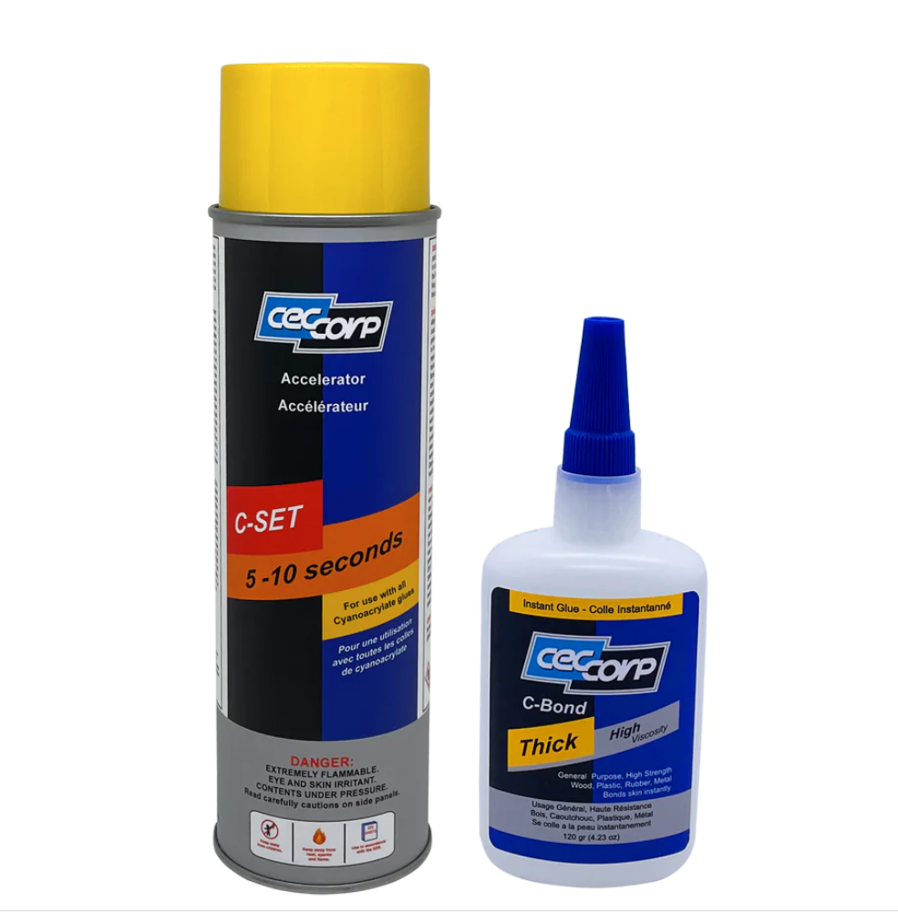 This Kit includes C-SET Accelerator Aerosol 340 g and C-BOND Thick 120 g instant glue. C-SET Accelerator is commonly paired with high viscosity glues, as thicker viscosity glues take longer to dry.