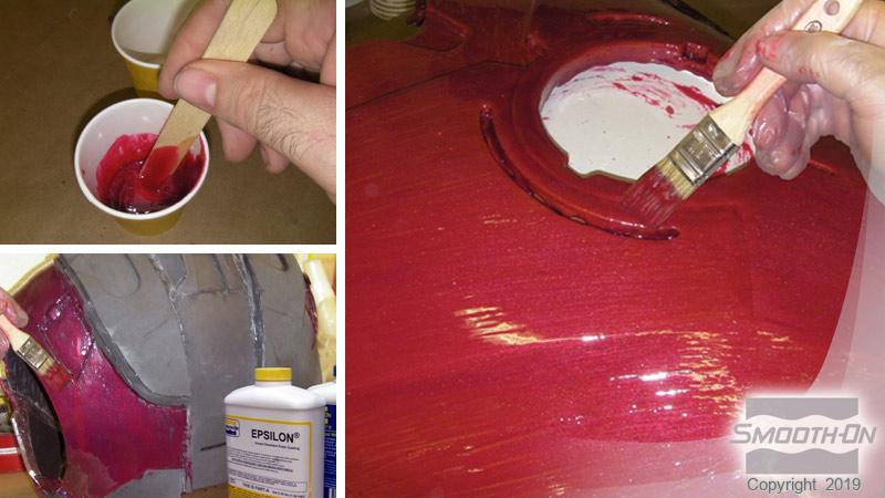 Applied in thin layers, mixed material holds a vertical surface without sagging or slumping. Material wets out uniformly over different surfaces. Pot life is 22 minutes, with a re-coat time of 3 hours. All layers should be allowed to cure for 16 hours at 73° F / 23° C and can be accelerated with mild heat. Epsilon™ PRO is clear and can be easily colored using Ignite™ or UVO™ colorants. Cured coating has a gloss finish and can be sanded, primed and painted.
