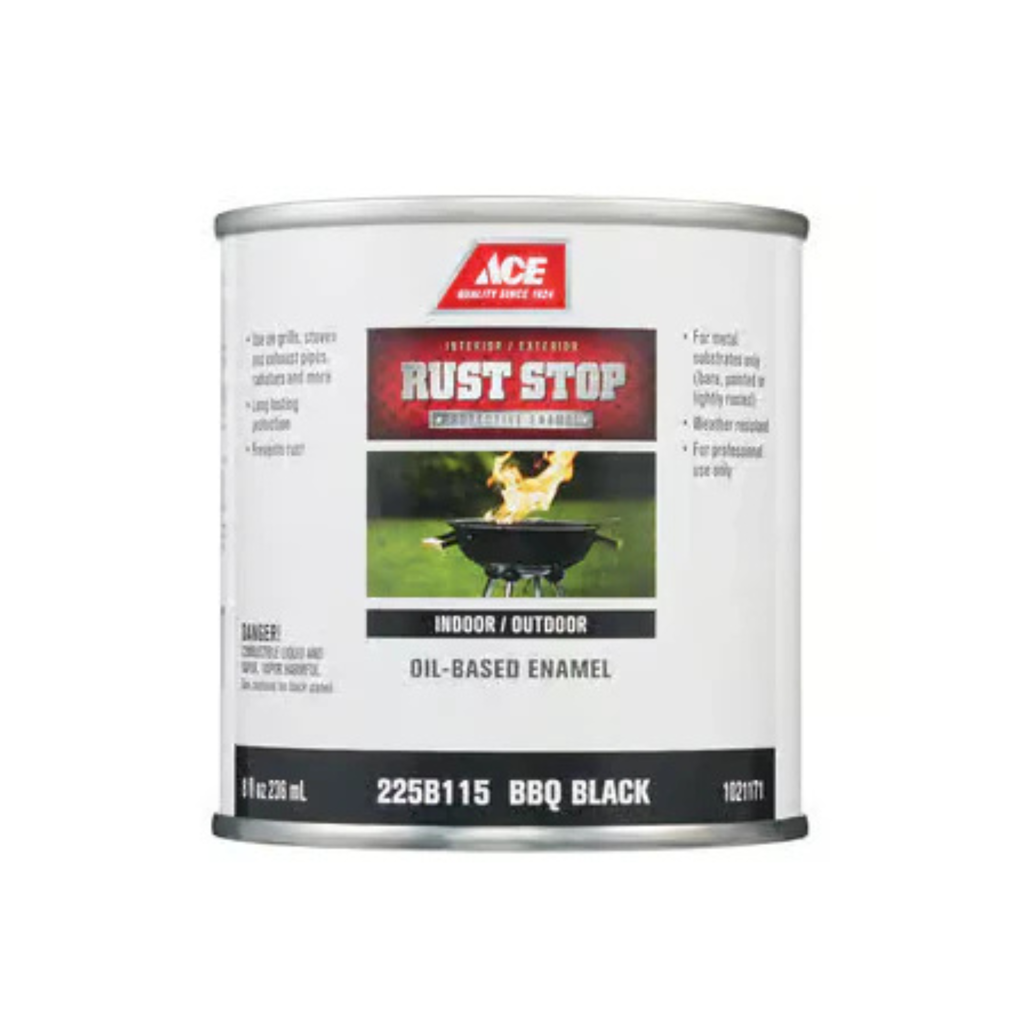 Ace Rust Stop BBQ Black silicone alkyd gloss enamel is formulated to beautify and protect: barbecue covers, stoves, radiators, space heaters, exhaust pipes, lamps, furnaces, fireplace screens and equipment.
