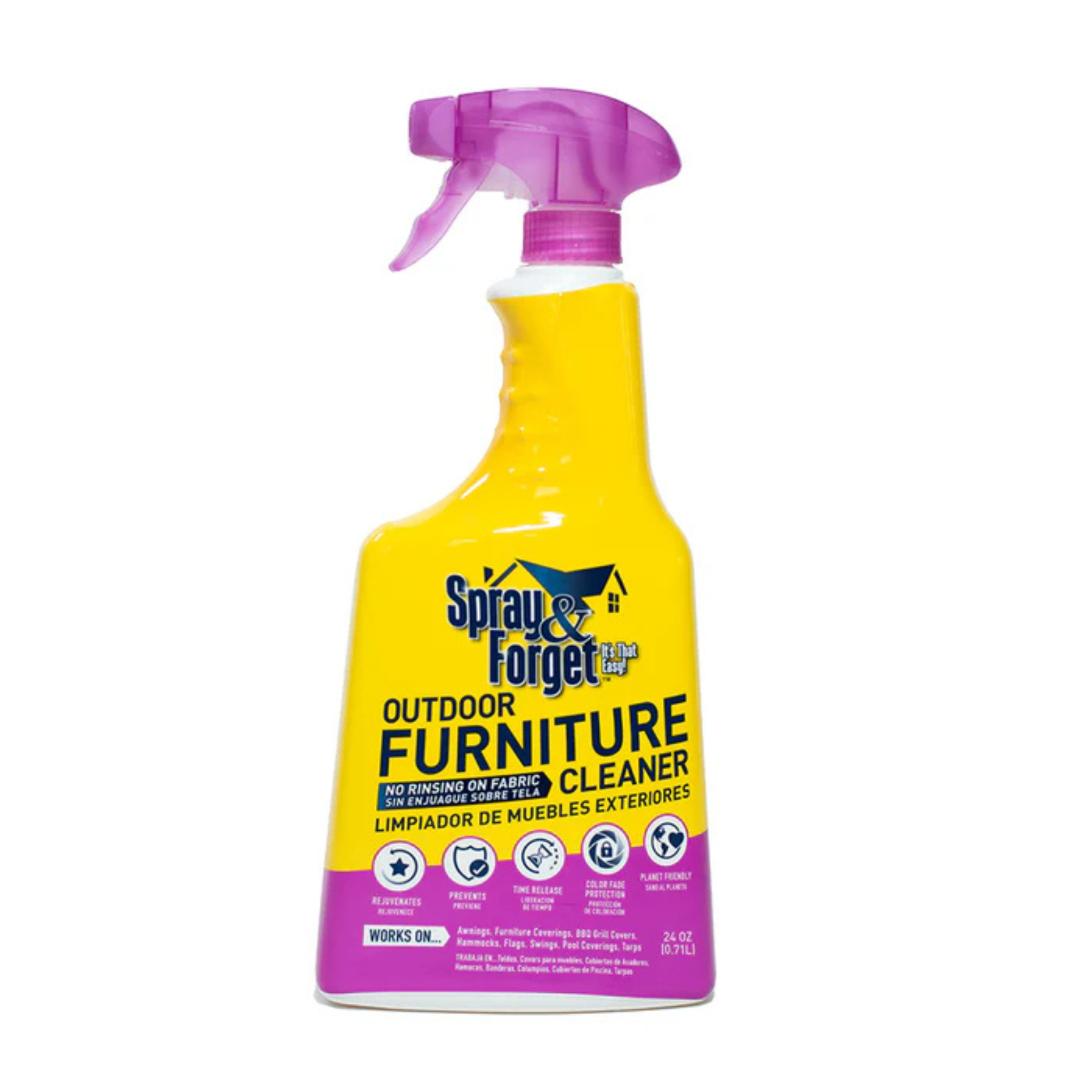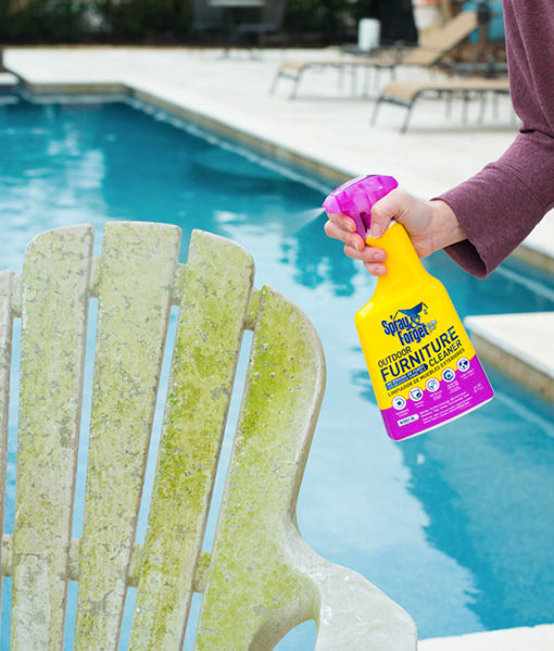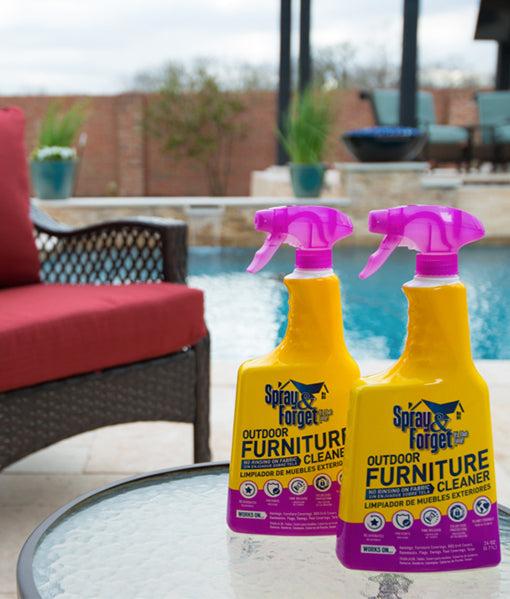 Spray & Forget is a unique, outdoor furniture cleaner that works to remove dirt, grime, bird droppings and leaf tannins. It also removes green and black biological stains caused by algae, mold, and mildew. Spray and Forget shines and rejuvenates hard surfaces as well as provides UV protection and a protective barrier to prevent stains caused by biological growths from returning. Works great on patio furniture, furniture covers, BBQ grill covers, awnings, hammocks, flags, pool coverings and many other outdoor surfaces.