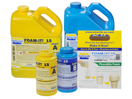 Smooth-On’s FOAM-iT!™ Series are two-component water blown rigid foams that are versatile and easy to use. FOAM-iT!™ products are available in 3lb., 4 lb., 5 lb., 8 lb., 10 lb.,15 lb. or 26 lb. per cubic foot densities. Parts A and B are measured and mixed in equal amounts by volume. The mixture is then poured into a mold or other form (apply release agent if necessary). The mixture will expand many times original volume (depending on which FOAM-iT!™ product you are using) and develop a uniform cell structure. FOAM-IT!™ 15 is tack-free in about 4 - 6.5 minutes, developing handling strength in 20 minutes and full cure in 2 hours.