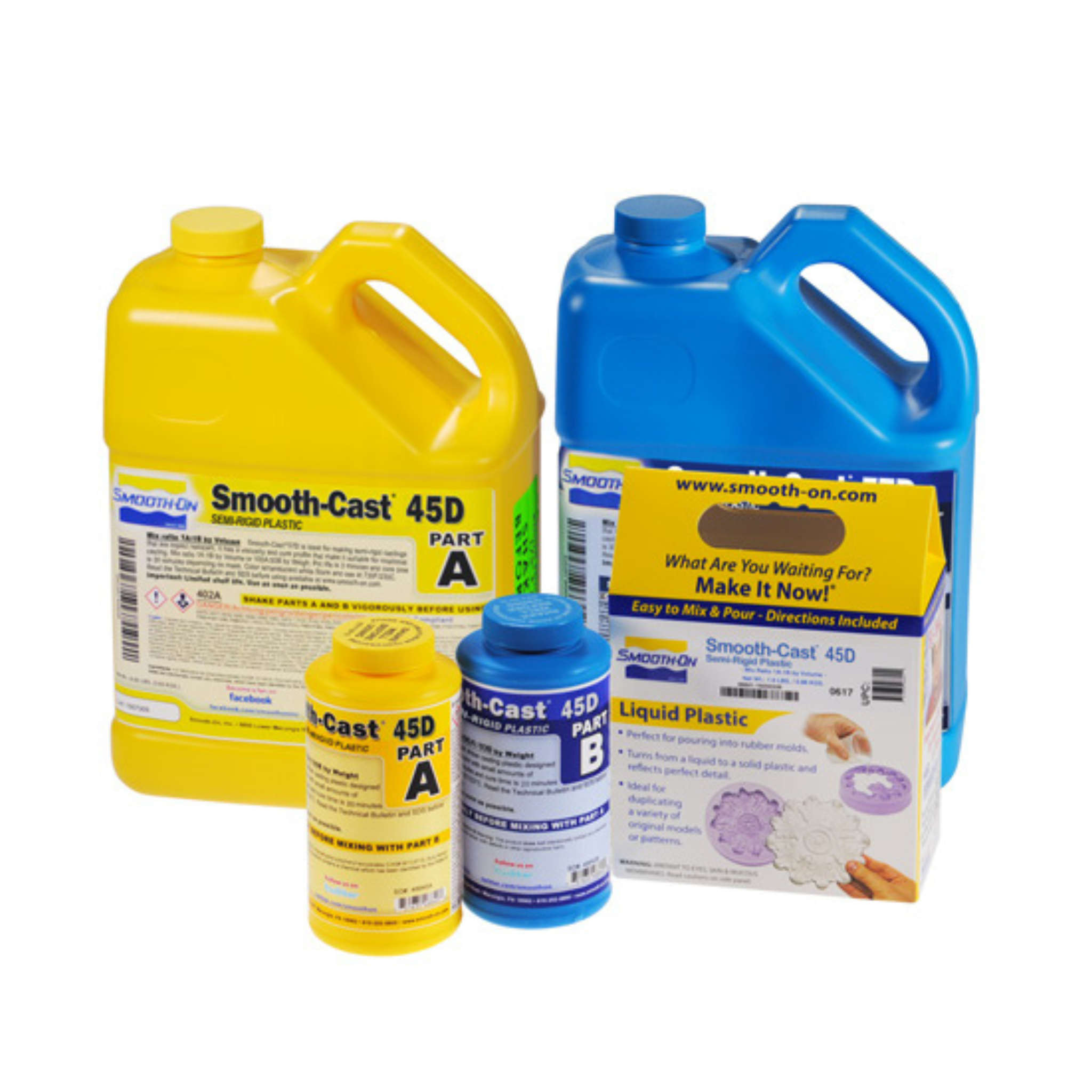 Smooth-Cast™ 45D is newly reformulated with a translucent white appearance and improved physical properties. All Smooth-Cast semi rigids are now mercury free and phthalate free. These plastics are easy-to-use (mix ratio is 1A:1B by volume) and have low viscosities for minimal bubble entrapment. Vibrant colors are possible by adding SO-Strong™, UVO™ or Ignite™ colorants.
