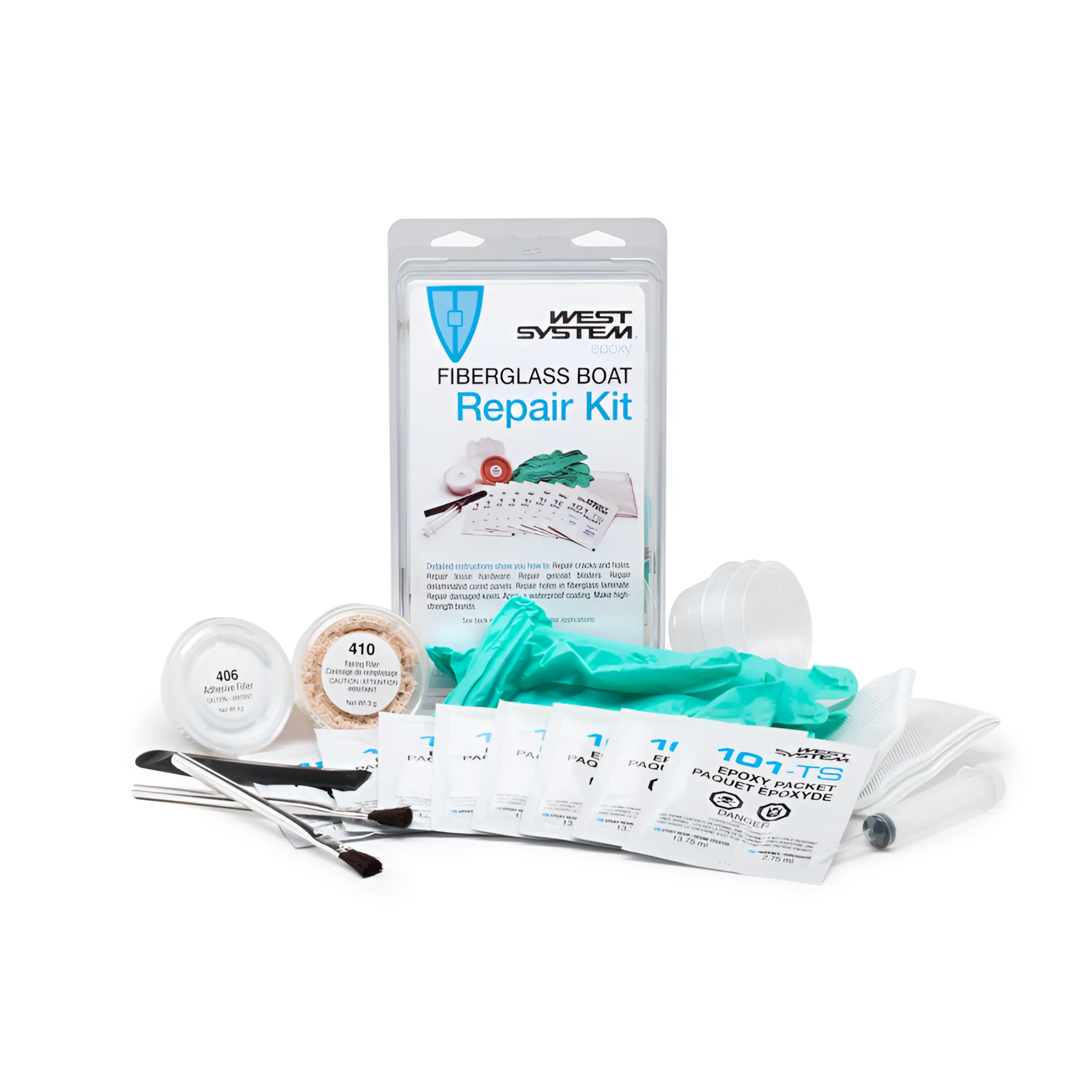 Each Fiberglass Boat Repair Kit contains eight packets of WEST SYSTEM 105 Resin and 205 Hardener, fiberglass fabric, adhesive filler, fairing filler, glue brushes, mixing pots, a mixing stick, an application syringe, three pairs of protective gloves and illustrated instructions for completing a variety of common fiberglass repairs.