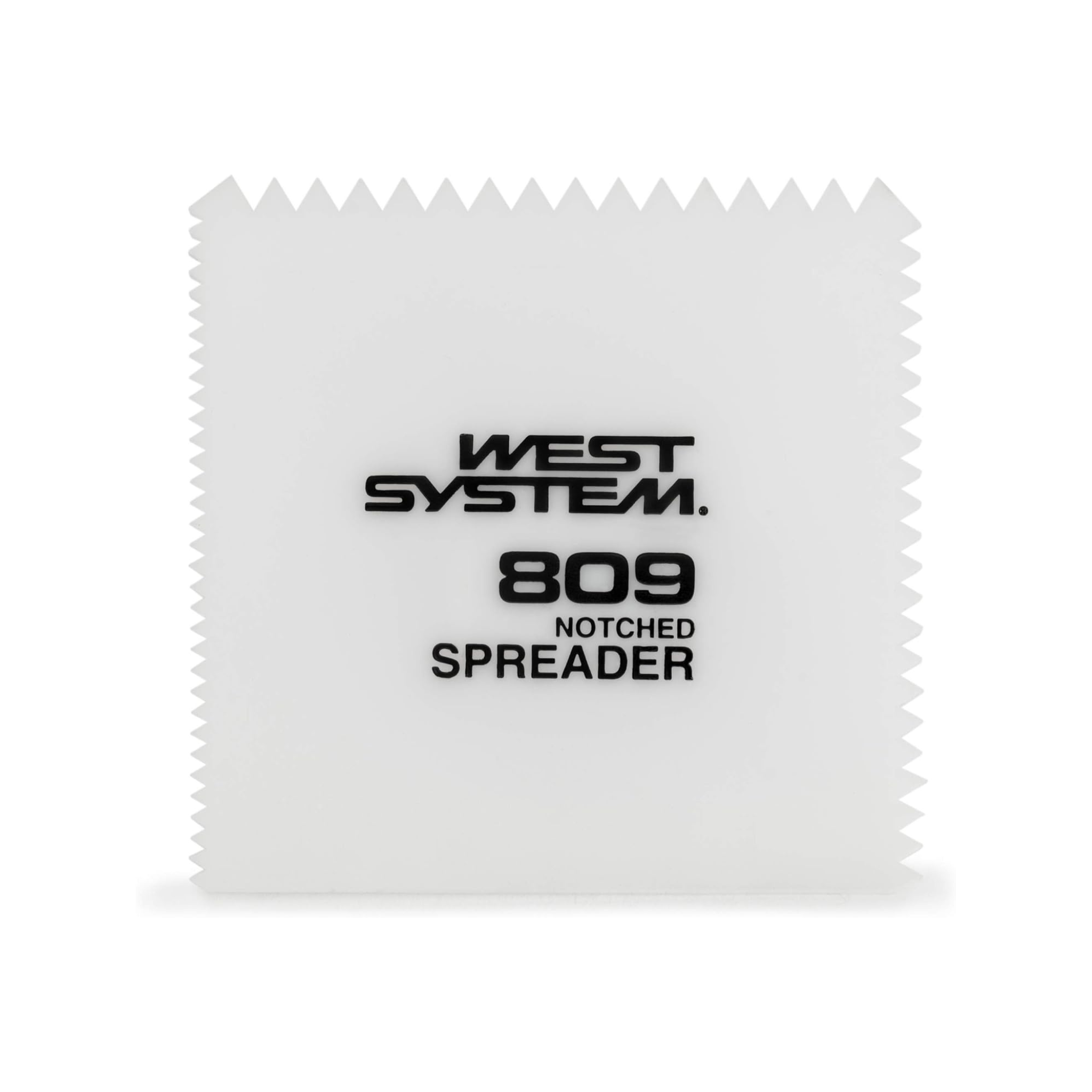 4" x 4" plastic spreader with 1/8", 3/16" and 1/4" notches on three sides for quickly applying modified epoxy at a constant rate. Useful when laminating large panels.