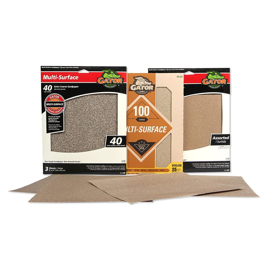 Gator's multi-purpose aluminum oxide sandpaper provide excellent performance at a value price. These sheets are ideal for both hand and power tool sanding on wood, metal, fiberglass & painted surfaces.
