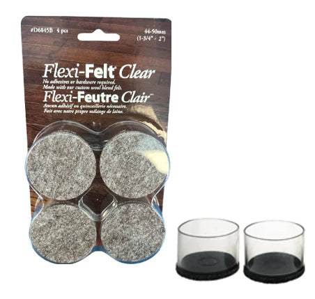 Flexi-Felt Clear pads are made with a natural wool blend, which is soft enough to protect your floors, and 15 times more durable than synthetic pads. This pack come with four Flexi-Felt Clear pads that fit 1 3/4" to 2" (44mm - 50mm) diameter and can stretch to fit any leg shape.