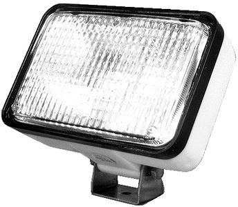 Rigid nylon, fiber filled housing with 304 stainless steel mounting bracket and hardware. 55W halogen beam. Fastens with 1/4\" screws. Draws 4 to 5 amps.