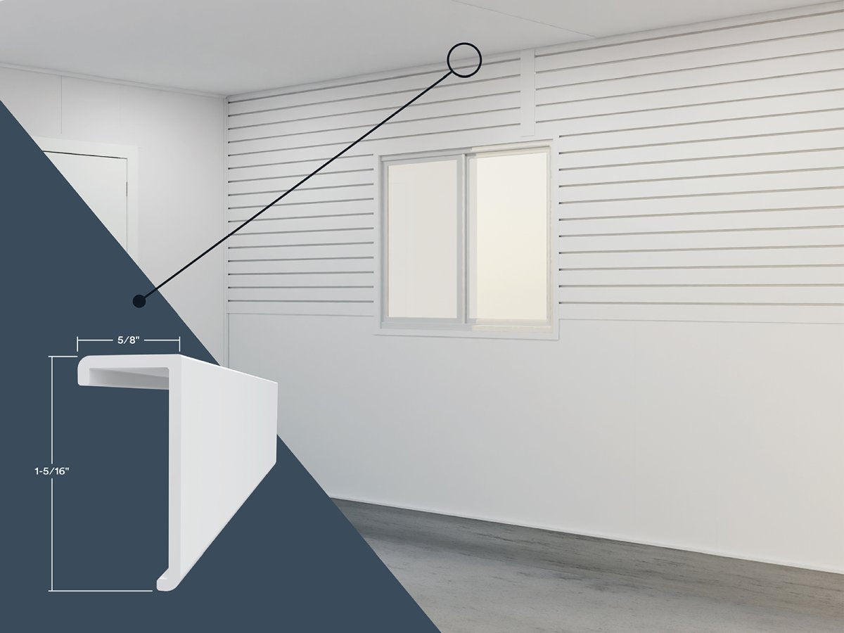 A finishing trim for the top of a Trusscore SlatWall assembly that prevents dust and dirt from accumulating behind the panels.