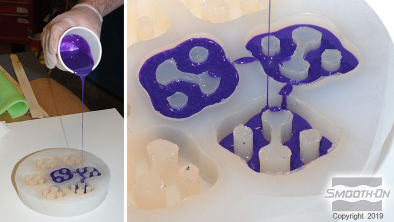 Pouring - For best results, pour your mixture in a single spot at the lowest point of the containment field. Let the rubber seek its level up and over the model. A uniform flow will help minimize entrapped air. The liquid rubber should level off at least 1/2” (1.3 cm) over the highest point of the model surface.