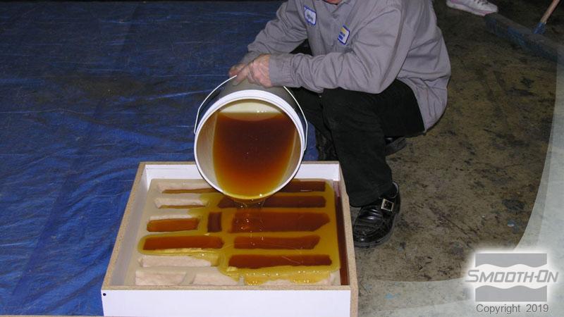 Pouring - For best results, pour your mixture in a single spot at the lowest point of the containment field. Let the rubber seek its level up and over the model. A uniform flow will help minimize entrapped air. The liquid rubber should level off at least 1/2” (1.3 cm) over the highest point of the model surface.