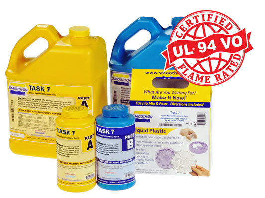 Task 7 Flame Out™ is a low viscosity, fast set casting resin that meets UL 94 V-O requirements for flame resistance. It does not contain mercury, TDI or MOCA. Mix ratio is 1A:1B by volume. Pot life is 2.5 min. and demold time is 10 min. at 73°F / 23°C (depending on mass).