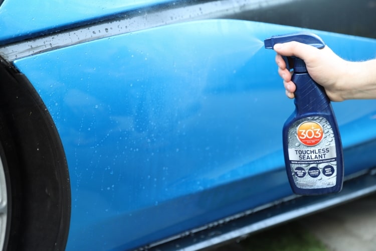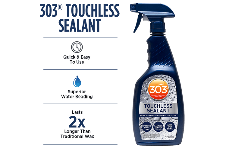 Have you had trouble finding time to wax your car thoroughly? 303® Touchless Sealant will save you hours! This Si02 formula is an entirely TOUCHLESS and quicker alternative to waxing your vehicle. Simply spray on, and rinse off – it’s that easy! It only takes minutes to get that same water beading protection you get from a full wax, saving you hours spent in the garage. It’s also great for those looking to prolong the time between waxes or ceramic coatings. Safe for clear coat, gel coat, fiberglass, plastics, windshields, and wheels too!