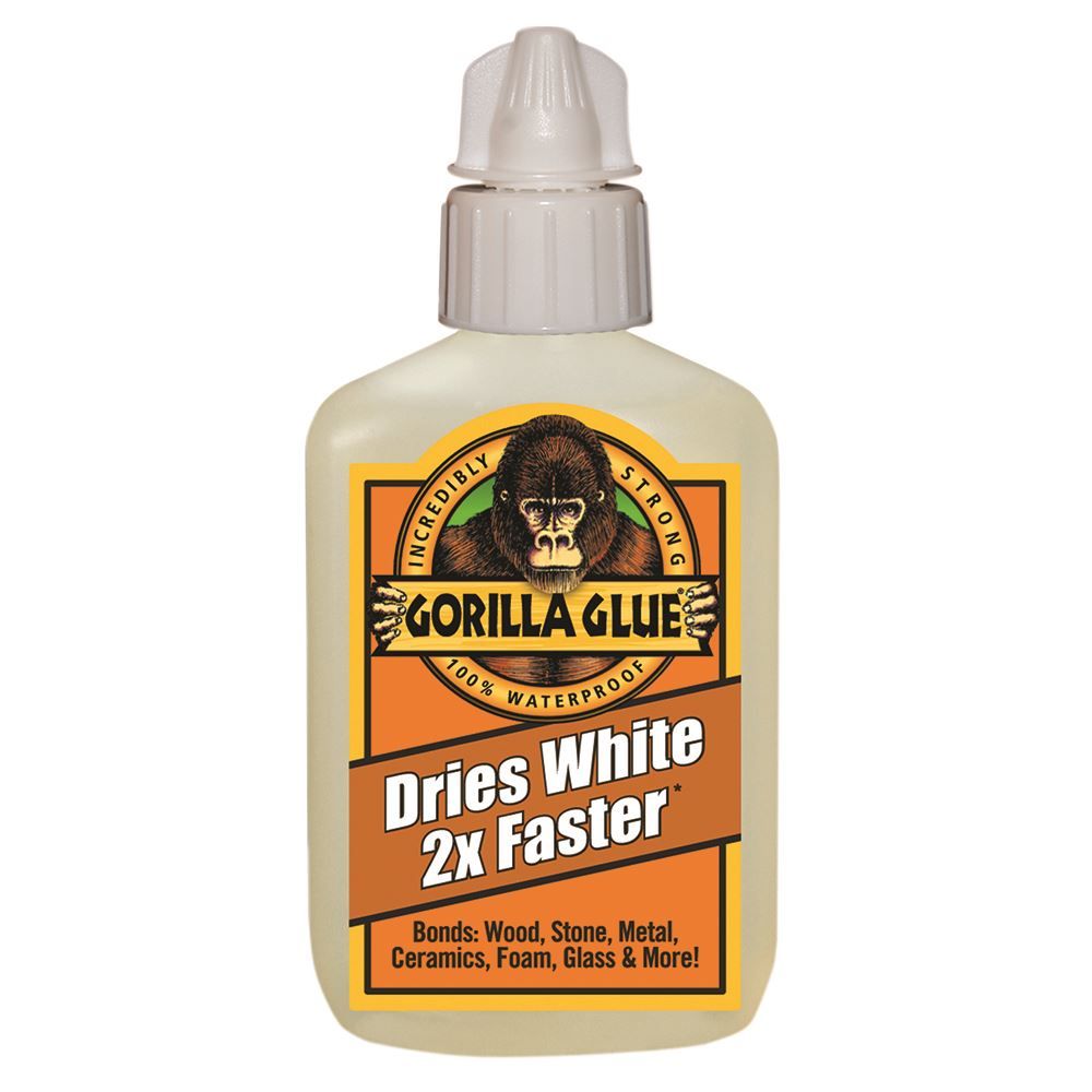 Gorilla Glue Dries 2Xs Faster. This glue dries 2 times faster and dries white and comes in a 2 oz. bottle. It dries two times quicker than our brown formula. Just 30-60 minutes clamp time. Plus, it dries to a soft white color, which makes it perfect for crafters, model-makers, woodworkers using lighter woods. It's also great for those quick fixes and don't forget, you get speed without sacrificing Gorilla Glue strength. Building, creating and repairing has never been easier. This glue bonds materials other adhesives simply can't, metal, stone, wood, ceramics, foam, glass and much more. It's still the best glue for anyone who wants the job done right. It has a shorter clamp time, between 30 and 60 minutes. It has an open working time, up to 5-10 minutes for perfect positioning. It is ideal for most household fixes, building repairs and creative projects. This glue is 100% waterproof and does not break down when exposed to outdoor elements. It easily passes ANSI/HPVA HP-1-2000 Types 1 and 2. Once it's dry Gorilla Glue is unaffected by extreme heat or cold and can be sandable, paintable and stainable the invisible glue line makes finishing easy.