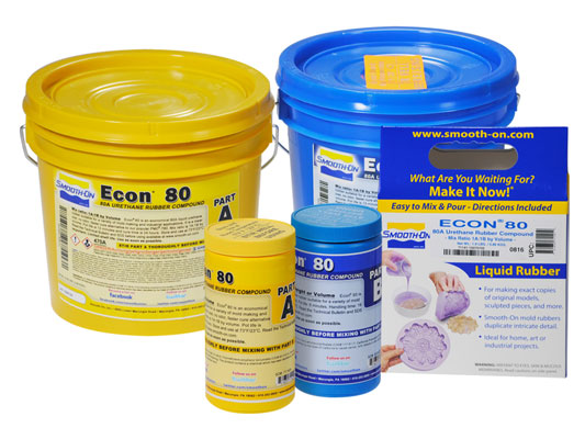 Econ™ 80 is an economical Shore 80A urethane rubber suitable for a variety of mold making and industrial applications. It is a lower cost, faster cure alternative to our popular PMC™-780. Physical properties are lower vs. PMC™-780. This is a no odor system that features a 1A:1B mix ratio and a low viscosity for easy mixing and pouring. Working time is about 13 minutes at room temperature, handling time is 6 hours and rubber cures overnight. Econ™ 80 is translucent and easily colored with SO-Strong™ or Ignite™ colorants. Econ™ 80 is used to make short run molds for casting concrete and resins, concrete stamping pads, rubber mechanical parts, coating fabrics, pour-in-place gaskets for industrial equipment and burial vaults.