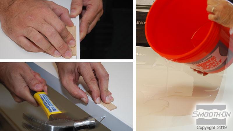 Pouring - For best results, pour your mixture in a single spot at the lowest point of the containment field. Let the rubber seek its level up and over the model. A uniform flow will help minimize entrapped air. The liquid rubber should level off at least 1/2” (1.3 cm) over the highest point of the model surface.